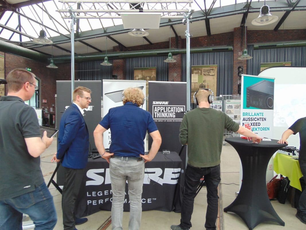 Die kleine, aber feine Ausstellung ergänzte die Vorträge durch passende Produktlösungen, ob Dante-basierte Audioprozessoren, kompakte Laserbeamer, verfahrbare Indoor LED-Wand mit hoher Auflösung (1,2 mm Pixelabstand), Kollaboration-Displays oder moderne Beamforming Mikrofone. An den “Action Points” von Bose, Canon, Publitec, Sharp, Shure und Yamaha konnten die Besucher diese Lösungen im Detail begutachten.