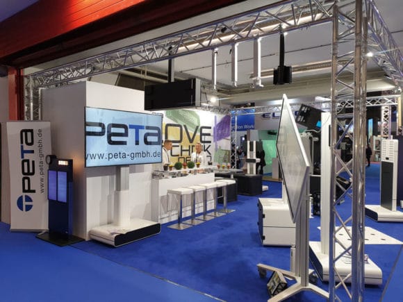 Auch für digitale Hinweisschilder, die auf Social Distancing Maßnahmen während der Corona Pandemie in Shops, Gastronomie und anderen öffentlichen Bereichen hinweisen, hat PeTa mit der „SAFETY Stele“ eine besondere Lösung entwickelt. Hier ist zusätzlich zu einem optionalen 43″ oder 49″ Display auch ein berührungsloser sensorgesteuerter Desinfektionsspender integriert.