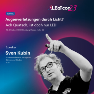 Wir freuen uns sehr, Sven Kubin, Präventionsberater Bühnen & Studios VGB, als Teilnehmer des Panels „Augenverletzungen durch Licht? Ach Quatsch, ist doch nur LED!“ auf der LEaT con 2023 begrüßen zu dürfen.