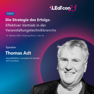 Thomas Adt, Geschäftsführer und Vertriebsexperte von Adt Consulting, wird auf der LEaT con 2023 eine inspirierende Keynote mit dem Titel „Die Strategie des Erfolgs: Effektiver Vertrieb in der Veranstaltungstechnikbranche“ halten.