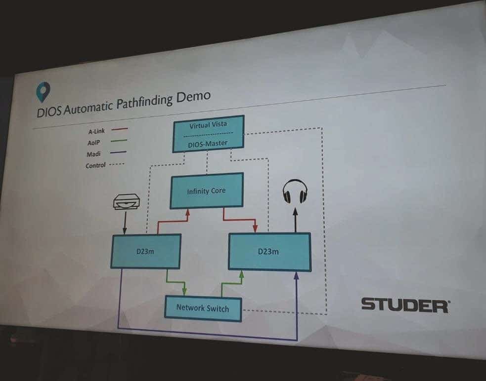 Von der Idee her sind alle Ein- und Ausgänge im Verbund gleichberechtigt, unabhängig vom Schnittstellentyp. Der Nutzer muss also nicht mehr in getrennten Systemen routen, wenn z. B. bei Veranstaltungen verschiedene Technologien aufeinandertreffen. In Analogie zu einem Navigationssystem existieren nur noch Wege und Ziele und wenn ein Weg versperrt ist, dann sucht DIOS einen anderen. Dass dies funktioniert, demonstrierte Studer auf der POSTNAB-Show 2017 bei TPC, einer Tochtergesellschaft der Schweizer Fernseh- und Rundfunkanstalten SRF SSR in Zürich: Bei Unterbrechung der Studer-eigenen A-Link-Verbindung übernahm die Dante-Verbindung zwischen zwei D23m automatisch die Signalweiterleitung. Nach Ausstecken der Dante-Verbindung sorgte MADI für den Signalaustausch.