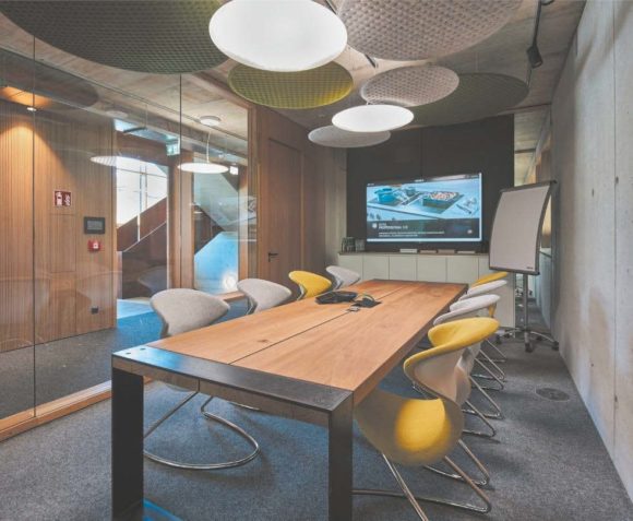 Die Kombination der DALI-LED-Pendelleuchten Modul R mit den Akustikabsorbern Rosso (beides Nimbus) prägt das Deckenbild des Konferenzraumes. (Bild: Josefine Unterhauser / Licht im Werkhaus)