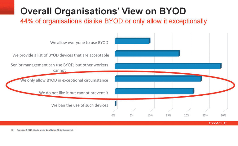 Eine Studie, die das IT-Beratungsunternehmen Quocirca im Auftrag von Oracle 2013 europaweit durchführte, offenbarte bei den 700 befragten Managern großer Unternehmen erhebliches Misstrauen gegen das BYOD-Konzept. 44 Prozent der befragten Unternehmensvertreter aus sieben europäischen Regionen halten nichts vom Einsatz privater Mobilsysteme in Unternehmen.