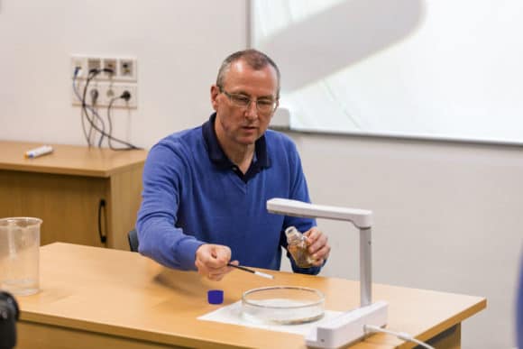 Michael Hilpert, Lehrer für Erdkunde und Chemie der Salvatorschule in Berlin, bereitet ein über Nacht ablaufendes chemisches Experiment vor. (Bild: Michael Hilpert)