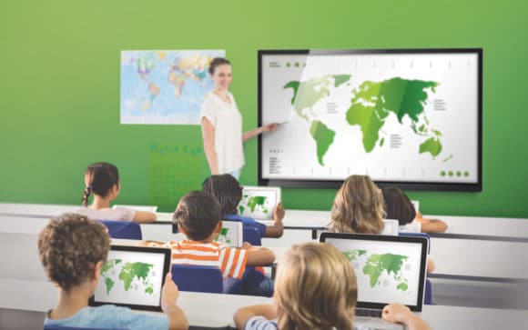 Durch den Einsatz digitaler Großdisplays verschwindet nicht nur die klassische Schultafel aus dem Klassenzimmer, auch die altbewährten geografischen Karten zum Ausrollen gehören der Vergangenheit an. Hier reicht ein Mausklick oder Touch-Befehl. (Bild: Syda Productions )