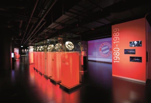 FC Bayern Erlebniswelt: Choreographierte Geschichte, Licht und Medien in Wechselwirkung. In sieben Zeiträumen wird die Geschichte des FCB seit seiner Gründung am 27. Februar 1900 bis heute erzählt. (Bild: Ranger Design)