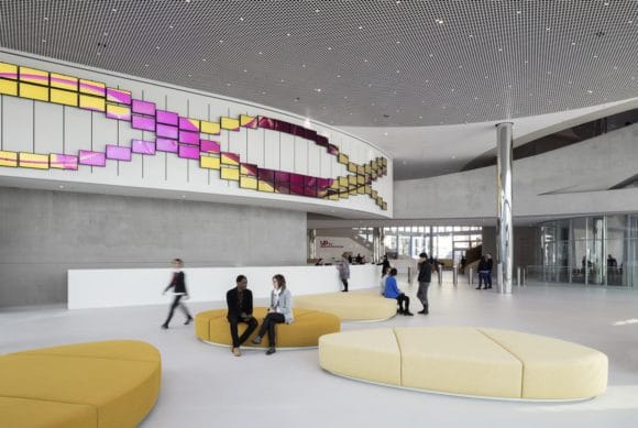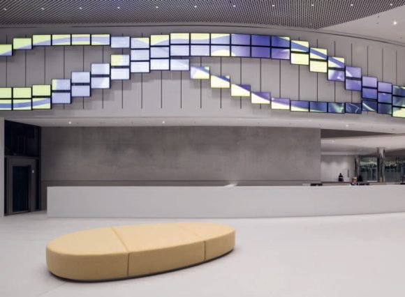 „Das Herzstück unserer Zentrale ist unser neues Innovationszentrum.“ Medial spiegelt das die kinetische Display-Installation „Inspiration Wall“ im Foyer wider. Dr. Ing. Dietmar Möller, One Global Headquarters Merck KGaA, erläutert: „Merck ist Hersteller der Flüssigkristalle, die für unsere lichtstarken AUO-Displays verwendet wurden. Der inhaltliche Bezug zu physikalisch und biologischen Strukturen wird bildlich abstrahiert und in den sich bewegenden Displays in der Medieninstallation aufgegriffen.