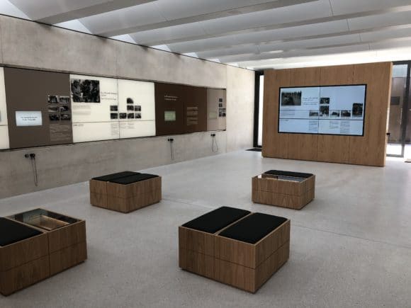 High-Brightness-Monitore und Einhand-Kopfhörer entlang des „Zeitstrahls“ im „Raum der Information“ informieren den Besucher interaktiv beim Gang durch die Ausstellung. 55″- Steglos-Monitore in einer 2 × 2-Kombination bilden zusammen einen Großbildmonitor für größere Besuchergruppen. Fachplaner: Thomas Hülsmann (Bild: ThomNet Media Engineering)