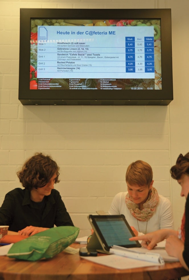 Solche Lösungen erfordern zwingend einen integrierten Zugang zu einem Kalender (z. B. Outlook oder Lotus) und als Add on die Erweiterung um Türbeschilderung. Auch eine Lösung für die Kantine des Unternehmens, z. B. ein Menü-Board, kann leicht hinzugefügt werden. Unternehmen, die die Bildschirme für Werbezwecke nutzen, haben wiederum ein anderes Anforderungsprofil.