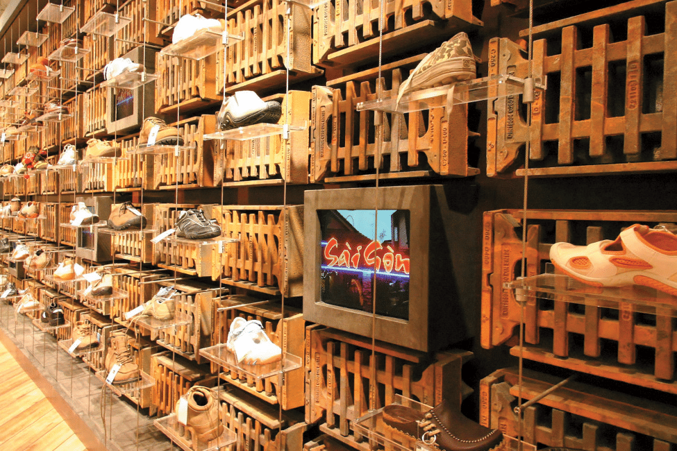 Dank audiovisueller Medientechnik scheinen Vögel zwitschernd über die Besucher hinweg zu fliegen; an vielen Stellen sind Bildschirme in Wände eingebaut, die stimmige Naturvideos zeigen und über die neusten Angebote und Events informieren. Stelen mit integrierten Screens an den Aufzügen weisen dynamisch auf das Sortiment auf den jeweiligen Etagen hin und sogar in den Schuhregalen findet man Monitore, die auf die Verwendung der Schuhe, z. B. Trekking oder Streetwear, hinweisen. Ein Beispiel für die verkaufsfördernde Wirkung von Objektdesign & Signage aus jüngster Vergangenheit ist die Filiale des irischen Textildiscounters Primark in der Düsseldorfer Schadowstraße. Zahlreiche Displays präsentieren hier die aktuellen Angebote oder agieren als dynamische Etagenverzeichnisse. Das von der Londoner Retail Design Agentur Dalziel and Pows entwickelte und von Handy AV realisierte Konzept setzt auf circa zwanzig 70″ Samsung-Displays im Portrait-Modus. Zusätzlich sollen Bilder auf LED-Walls, vorwiegend im Außenbereich, die gewünschte Fernwirkung erreichen. Displays im Eingangsbereich zeigen als Content Angebote und das Etagenverzeichnis.