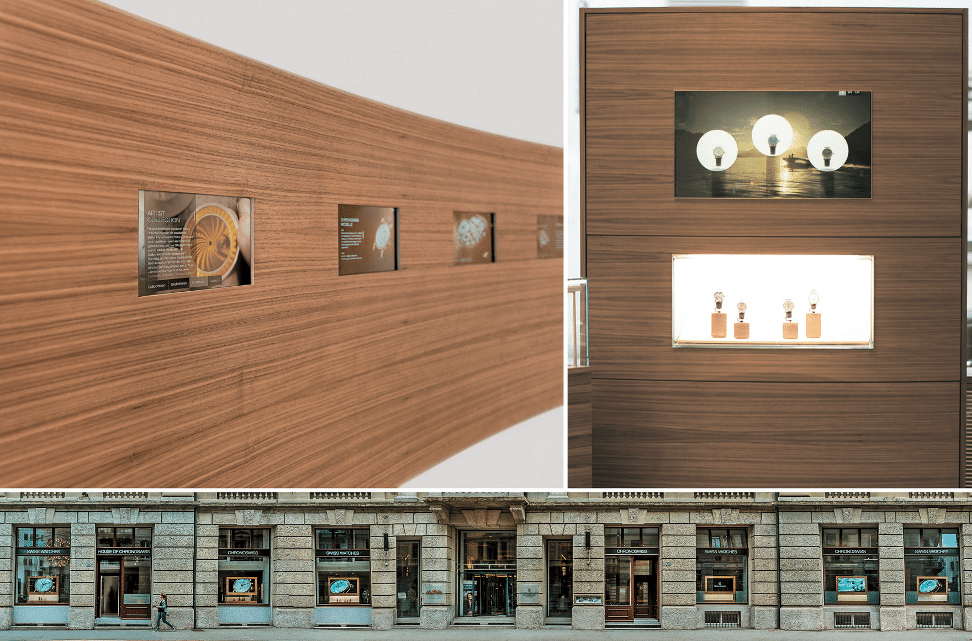 Einen Schritt weiter geht das House of Chronoswiss, Hauptsitz des Uhrenmachers Chronoswiss in Luzern: Der Schweizer Digital-Signage-Spezialist ScreenFoodnet gemeinsam mit dem Partner Martin Esser beschränken sich nicht auf Schaufenster-Displays, sondern haben auch interaktive Elemente einbezogen. Das Konzept bezieht allerdings die Schaufensterfront mit ein: Sieben große Bildschirme sind unter anderem in die Schaufenster integriert worden, um die Aufmerksamkeit von Passanten von außen auf den Store zu lenken. Dort führt ein mit Touchscreens ausgestattetes Historama die Besucher durch die 30-jährige Firmengeschichte des Uhrenmachers. Zusätzlich gibt es „digitale Vitrinen“, die mehr zeigen können als die realen Exponate.