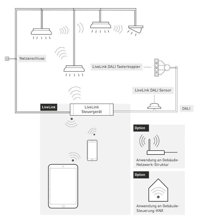 Ebenso ist der Einsatz bei historisch wertvoller Bausubstanz, auf Glastrennwänden, Sichtbeton oder Sichtmauerwerk oder wenn die Bedienung sehr flexibel bleiben soll, durchaus sinnvoll und als notwendig zu betrachten. Das Hauptanwendungsgebiet liegt, vereinfacht betrachtet, in der Steuerung von Beleuchtungs- und Verdunklungsanlagen und der Raumtemperaturregelung. Über entsprechende Buszentralen können auch weitere Funktionen wie Alarmanlagen und Anwesenheitssteuerungen in das Netzwerk eingebunden werden. Durch Gateways lässt sich ein solches System auch in andere, z. B. an Kabel gebundene Steuerungen integrieren und so weitestgehend grenzenlos ausbauen.