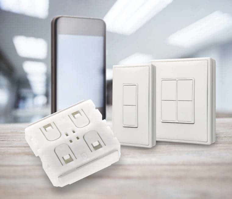 EnOcean bietet auch batterielose Funkmodule für BLE-Systeme (Bluetooth Low Energy) mit 2,4 GHz. Das batterielose Schaltermodul PTM 215B ist erstmals mit einer NFC-Funktionalität ausgestattet und soll so das Einlernen und Konfigurieren des Schalters vereinfachen. (Bild: EnOcean GmbH)