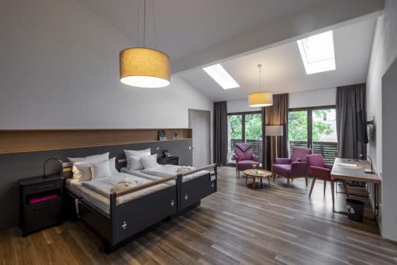 Die Gestaltung der Zimmer und Suiten erinnert eher an den Aufenthalt in einem luxuriösen Hotel als an eine Rehabilitationseinrichtung. Wohnliche Leuchten mit warmer Lichtfarbe sorgen für das gewünschte Ambiente. (Bild: Molto Luce GmbH / Alexander Schwarz)