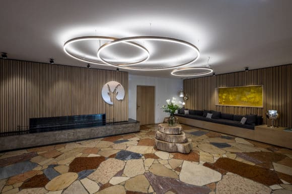 Im Zentrum des Empfangs befindet sich ein Lichtobjekt aus direkt und indirekt strahlenden Profilringen, die durch ihre ineinander verschachtelte Anordnung und die filigrane Erscheinung ein großes Maß an Leichtigkeit ausstrahlen. Die teils mit Echtholz verkleideten Wände werden durch die dekorativen Strahler an den Wänden spannend inszeniert und erzeugen ein entsprechendes Spiel aus Licht und Schatten.