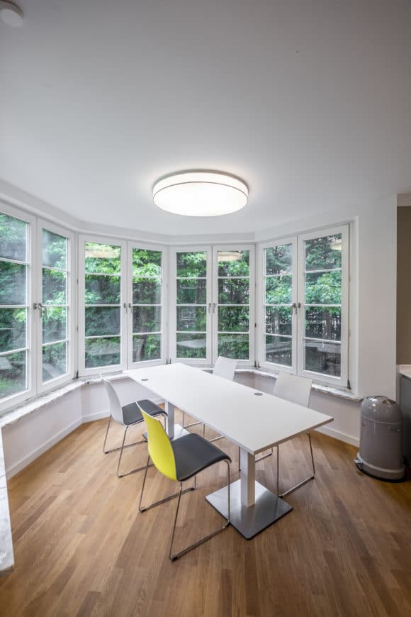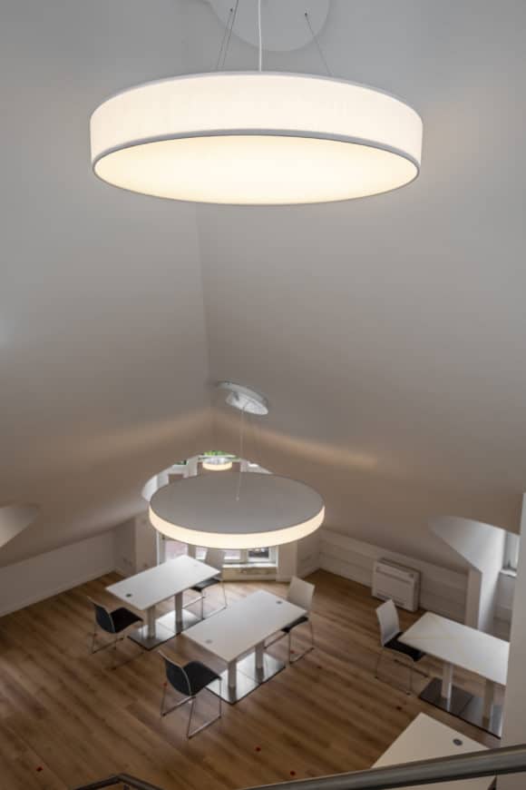 Die runden Deckenleuchten wurden je nach Bedarf abgependelt oder deckennah montiert. Der Diffusor wirft ein weiches und blendfreies Licht in den Raum und bietet trotzdem ein überdurchschnittlich hohes Ausleuchtungsniveau. (Bild: Molto Luce GmbH / Alexander Schwarz)