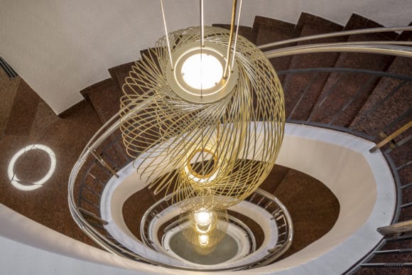 Im Treppenauge befindet sich ein goldfarbenes Lichtobjekt, welches sich an drei Abhängungen durch alle Etagen erstreckt. Die luftigen Lichtkugeln werden sowohl von innen als auch von den darüber und darunter befindlichen Körpern angestrahlt. Dadurch haben sie eine faszinierende Lichtwirkung. Farbe, Form und Montageart passen in das historische Ambiente und wirken wie ein geschmackvolles Überbleibsel aus vergangenen Jahren.