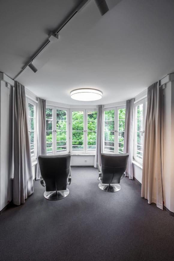 Im Ruheraum, in dessen Erker sich zwei bequeme Relaxsessel mit Aussicht in den natürlich gestalteten Garten befinden, wird mit einer Mischung aus Decken- und Stehleuchten sowie mit einem optional zuschaltbarem Schienensystem gearbeitet, um in dem Raum die benötigte atmosphärische Entspannung zu gewährleisten.