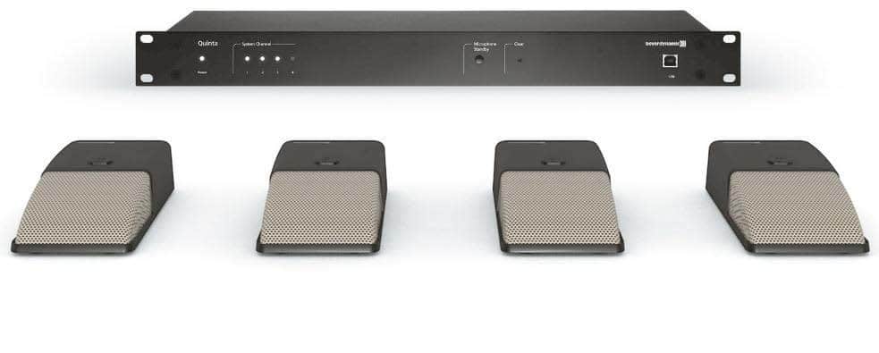 Das drahtlose Grenzflächenmikrofon Quinta TB hat eine Halbnierencharakteristik, die Rückkopplungen vermeiden soll. Das Mikrofon verfügt über integrierte Sende-/Empfangsantennen in einem Kunststoffgehäuse mit schwarzer Softtouch-Oberfläche und einem Einsprechgitter in Edelstahloptik und ist für den Betrieb innerhalb des Quinta-Konferenzsystems vorgesehen. Das Grenzflächenmikrofon Quinta TB kostet 699 €. Die Steuereinheit Quinta RS, die bis zu 20 Mikrofone verwalten kann, schlägt mit 2.380 € zu Buche.