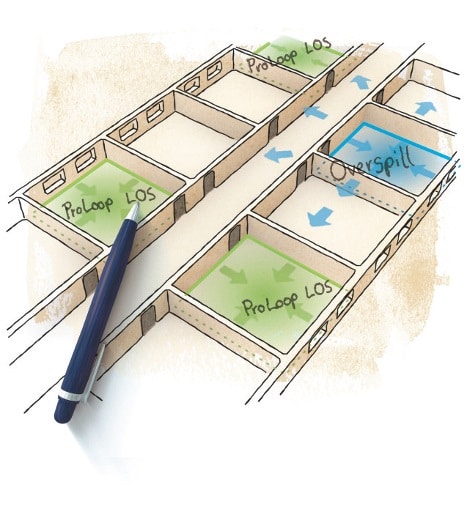 Oft reicht eine einzige Schleife jedoch nicht aus, um in einem gegebenen Raum ein gleichmäßiges magnetisches Feld zu erzeugen. In einem solchen Fall sollte man auf sogenannte Phased-Array-Loops zurückgreifen, die eine ebenförmigere Abdeckung des fraglichen Raumes ermöglichen. Hier spielen mehrere aufeinander abgestimmte Induktivschleifen zusammen, um im gesamten Raum ein möglichst gleichmäßiges Feld aufzubauen, das notwendig ist, um über die gesamte Hörfläche die gleiche Audioqualität zu gewährleisten.