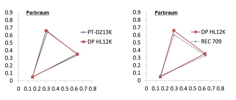 Farbraum DPI HL12K Laser-Phosphor 3-Chip DLP vs. Panasonic PT-DZ13 Dual Lamp 3-Chip DLP vs. REC 709 (Bild: Markus Ries)