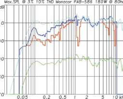 Die oben stehende Grafik zeigt die Messung für den PAB-586 für höchstens 3 % Verzerrungen (rote Kurve) und für höchstens 10 % Verzerrungen (dunkelblaue Kurve). Dort, wo beide Kurven zusammenfallen, wurde der 10 %- Grenzwert nicht erreicht, bevor man an sein Leistungslimit kam. Beide Kurven enden bei 11 kHz, da bei 48 kHz Abtastrate für höhere Frequenzen keine Auswertung der Verzerrungen mehr möglich ist.