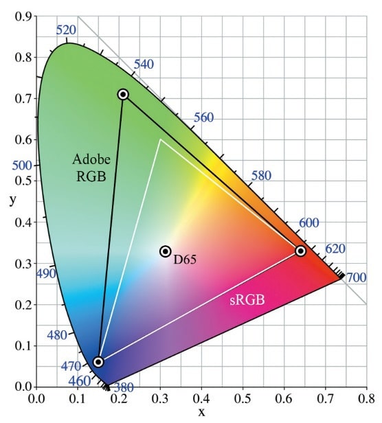 Der Farbraum für LCDs basiert auf dem CIE-Normfarbsystem der Internationalen Beleuchtungskommission CIE (Commission internationale de l’éclairage) und wird meistens im sRGB Spektrum (zu klein für Druck- und Grafikbearbeitung) oder im etwas größeren Adobe-RGB Farbraum (enthält 98 % aller druckbaren Farben) angegeben. Wichtig ist hier bei der Spezifikation auf den Begriff der prozentualen Abdeckung des angegebenen Farbraumes zu achten. Sehr gute Monitore haben 10 Bit oder mehr und ca. 98 % Abdeckung des Adobe-RGB Farbraums.