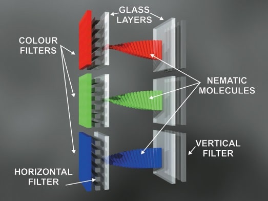 Wie funktionieren LCD Displays? Bei einem Liquid Chrystal Display – kurz: LCD – wird jeder Bildpunkt durch drei Subpixel in RGB (Rot-Grün-Blau) erzeugt. Bevor das Licht auf die Flüssigkristalle trifft, wird es polarisiert. Hinter den Kristallen befindet sich ein weiterer Polarisator. Zusammen mit der Treiberelektronik, den Farbfiltern und den Glasscheiben bilden sie das Panel.