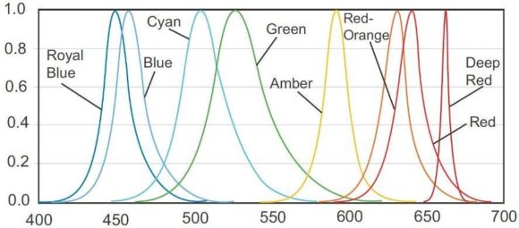Beispiel von Farbspektren der LED-Serie Rebel von Luxeon. Man erkennt ein relativ schmalbandiges Abstrahlverhalten. Quelle: Luxeon Rebel ES Datenblatt DS68 (Bild: Luxeon Rebel ES Datenblatt DS68)