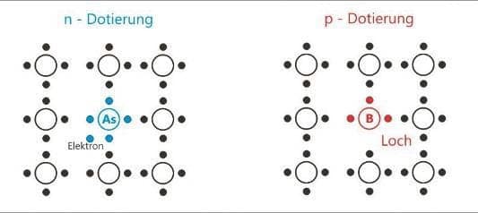 Silizium – mit vier Elektronen auf der Außenschale – bildet ein Kristallgitter, da die äußeren Elektronen gut eine Paarbildung ausführen. Damit stehen keine freien Ladungsträger für einen Stromfluss zur Verfügung. Erst bei Verunreinigung mit Fremdatomen wie Arsen oder Bor, die jeweils ein Elektron auf der Außenbahn zu viel oder zu wenig für das perfekte Kristallgitter aufweisen, sind freie Ladungsträger für ein Stromfluss verfügbar.