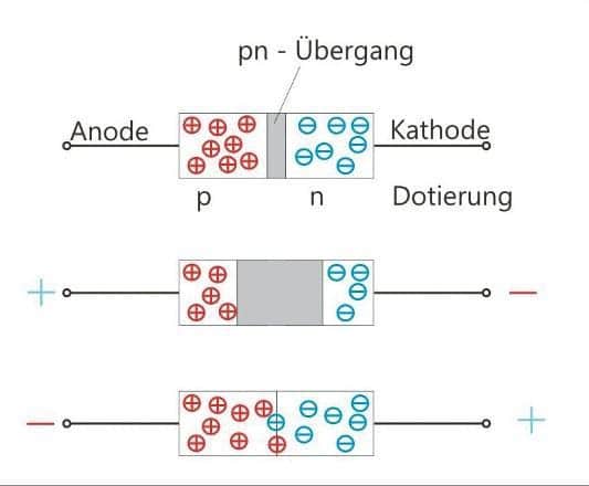 Treffen beide Stoffe aufeinander, werden sich in der Grenzschicht die freien Elektroden in die Löcherplätze einfinden, und somit ist dieser Körper elektrisch neutral und auch nichtleitend. Beaufschlagt man eine Spannung in Sperrrichtung, wird diese Schicht immer breiter. Ein Strom kann sich erst dann einstellen, wenn die Spannung wesentlich größer wird und dann irgendwann ein „Überschlag“ auftritt. Wird die Spannung in Flussrichtung angelegt, benötigt man eine kleine Spannung, um die Sperrschicht zu überwinden. Danach stellt sich ein Stromfluss ein.