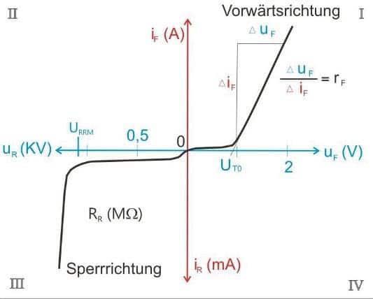 Das elektrische Verhalten einer Diode in Form einer Kennlinie: Man erkennt bei Anlegung einer Spannung in Durchlassrichtung, dass sich erst ein Stromfluss einstellt, wenn die Durchlassspannung überwunden wurde. Danach wird die Stromhöhe nur noch durch den inneren Widerstand der LED begrenzt. Kleinste Spannungsänderungen haben dann große Stromänderungen zur Folge. Deshalb ist es besser, eine LED über die Stromhöhe zu steuern anstatt mit der Spannung. In Sperrrichtung betrieben ist die LED recht robust, so dass Sie bei Verpolung einfach nicht leuchtet, weil kein Stromfluss zustande kommt.Schaltbild der Diode und der Leuchtdiode. Die Kathode wird meist gekennzeichnet, wobei man sich bei der T-Typ Leuchtdiode auch einfach merken kann, dass das längere Beinchen den Pluspol darstellt und damit die Betriebsstromrichtung vorgibt.