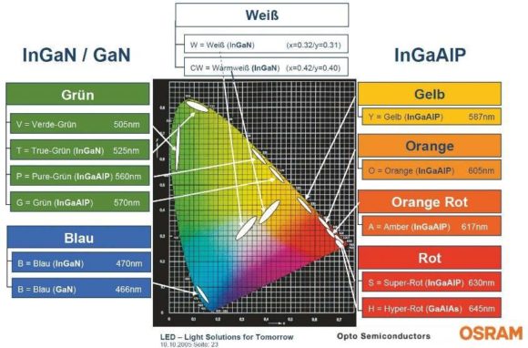 Anhand der Ellipsen lässt sich hier gut erkennen, dass man mit der entsprechenden Dotierung zwar die grundsätzliche Farbe bestimmt, aber dass man einzelne Atome für die Dotierung abzählen und genau platzieren kann. Somit ist immer eine Streuung der Werte – hier der Farben dargestellt – vorhanden. (Bild: Vortrag Osram LED-Light Solutions for tomorrow 2005 )