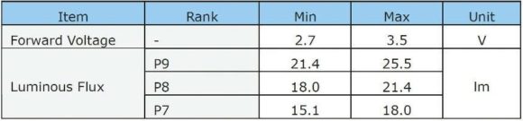 Die Angabe von drei Helligkeitsklassen für eine Weisslight LED Superflux NSPWR70CSS-K1 von Nichia. Als elektrische Parameter wird die Vorwärtsspannung als Bereich angegeben. (Bild: Datenblatt NICHIA Superflux 405609-da-01-en-LED_NSPWR70CSS)