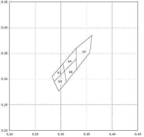 Grafische Darstellung der möglichen Farborte, die diese LED innerhalb ihres Bin annehmen kann. Der ideale Weißpunkt im CIE Farbdreieck mit Plank’scher Kurve wäre 0,333 für x und y. LEDs innerhalb eines Bins mit größerer Entfernung weisen größere Abweichungen auf als zwei nahe beieinander liegende zweier benachbarter Bins. Bei besonders kritischen Anwendungen, wie z. B. bildgebende LED-Verfahren, selektieren Hersteller selber die LEDs, um möglichst geringe Farbabweichungen innerhalb eines Produktes sicherstellen zu können. (Bild: Datenblatt NICHIA Superflux 405609-da-01-en- LED_NSPWR70CSS)