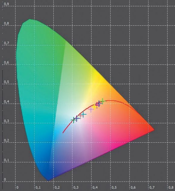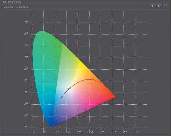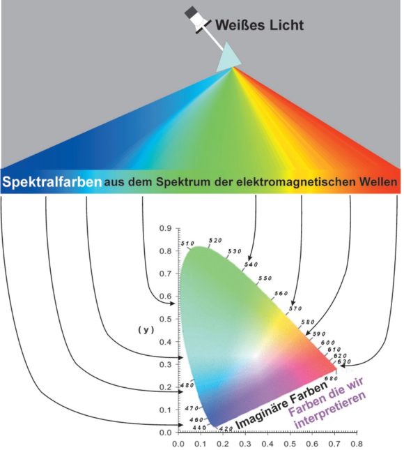 Weißes Licht ist die Summe aller Spektralfarben im Farbspektrum. Unser Auge meldet die Sinnesreize über seine farbsensitiven Zellen für Grün, Blau und Rot ans Gehirn, das wiederum aus diesen Informationen, kombiniert mit seinem Erfahrungsschatz, etwas Farbiges oder Unbuntes deutet. Daher sehen wir auch die Farbe Purpur bzw. Magenta durch die Reizung der roten und blauen Sinneszellen, obwohl sie im Spektrum nicht vorhanden ist. Um vom Menschen wahrgenommene Farbe numerisch zu lokalisieren, hat man ein zweidimensionales Farbdreieck entwickelt, in dem nun jede Farbe mit Angabe von x- und y-Werten bestimmt werden kann. Anhand dieses Farbdreiecks lassen sich sowohl der abbildbare Farbraum sowie die einzelne Farbe sehr gut darstellen. Zwischen zwei Farben bildet sich eine Linie. Darauf kann jede Farbe mittels Verschieben der Intensität der beiden Farben gemischt werden. Verläuft die Linie wie bei den Komplementärfarben Blau und Gelb durch den Weißpunkt, kann man auch Weißlicht mit den beiden Farben mischen. (Bild: Herbert Bernstädt)