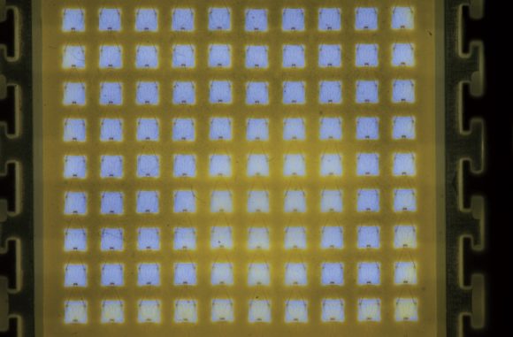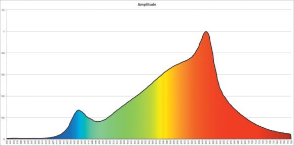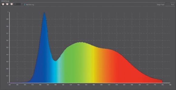 Der Farbort ist auf einen Punkt nächstmöglich an der planckschen Kurve (rote Kurve im Farbdreieck) gelegt. Der plancksche Kurvenzug entsteht dadurch, dass ein schwarzer Körper immer weiter erhitzt wird. Je heißer er wird, umso mehr strahlt er auch kurzwelligere Strahlung ab – aus rotglühend wird bläulich weiß. Ähnlich verhält sich auch ein Wolframfaden einer Glühlampe. Wir hier sprechen auch von Temperaturstrahlern. Entsprechend der Temperatur auf der Geraden definieren wir die Lichtfarbe, mit der die Leuchte strahlt. So entspricht 1800K ( Kelvin) einer Kerze, 2800K einer Allgebrauchsglühlampe, 3000K haben Longlife-Halogenlampen zu bieten und 3200K sind die typischen Halogenlampen, 3400K dagegen Fotostudiolampen. Für höhere Farbtemperaturen bediente man sich der Gasentladungslampen. Mit der LED und der entsprechenden Phosphormischung kann man jede Farbtemperatur erreichen. Einmal hergestellt, kann diese LED dann nur noch in dieser Farbtemperatur abstrahlen. (Bild: Herbert Bernstädt)Beispiel für ein LED-Array mit einem gemeinsamen Phosphorüberzug. Deutlich sind die blauen LED-Chips zu erkennen. Weiterhin kann man einen ungleichmäßigen Phosphorauftrag über der Fläche erkennen. Die Folge ist ein fleckiges Lichtbild. (Bild: Herbert Bernstädt)Spektralverlauf einer hochwertigen Weißlicht-LED mit hoher Farbqualität. Man erkennt das Lichtspektrum der blauen LED, gefolgt von einem Einbruch, der den Übergang markiert, ab wann die Konvertierung des kurzwelligen LED-Lichts in das langwellige Phosphorlicht erfolgt. Das Licht des Phosphors deckt den grünen bis rötlichen Bereich breitbandig ab. Dadurch entsteht eine höhere Farbqualität, da kaum Lücken im Lichtspektrum vorhanden sind, die jedoch im tiefroten Bereich schwächelt. (Bild: Herbert Bernstädt)Aus dem Lichtspektrum kann man die beiden Peaks der blauen und roten LED-Chips erkennen. Mit der roten LED wird die sonst übliche Rotschwäche von Weißlicht-LEDs entgegengewirkt. Auch hier ist das Konvertierungs-„Loch“ zu erkennen. Würde man nun das Spektrum einer Halogenlampe daneben halten, wäre schon eine sehr große Annäherung zu erkennen. (Bild: Herbert Bernstädt)