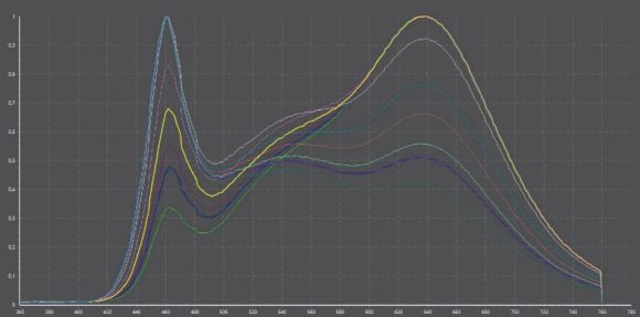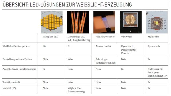 Eine andere Möglichkeit ist es, neben den reinen LED-Farben auch LED-Chips einzusetzen, die zwar in einer Farbe wie Amber oder Lindgrün strahlen, aber aus einem blauen Chip und entsprechenden Phosphorfarben zusammengemischt werden, um dann in der gewünschten dominanten Farbe zu leuchten. Durch die Phosphorsorten wird die Lichtfarbe auch nicht mehr so schmalbandig wiedergegeben wie bei dem reinfarbigen LED-Chip. Damit kann man die Lücken im Lichtspektrum gleichmäßiger auffüllen. Demgegenüber steht, dass man mit dieser Lichtfarbe keinen tief gesättigten Farbton erhält. Zum Zwecke eines variablen Weißpunktes im Zusammenspiel mit den anderen farbigen LEDs ist dies jedoch eine durchaus attraktive Lösung, um hohe Lichtqualitäten zu erreichen.