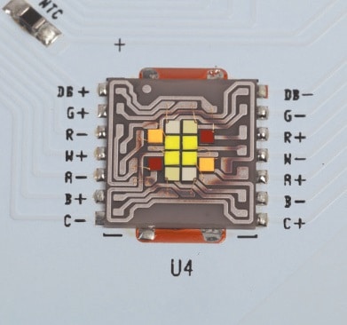 *1 Unter Redshift versteht man eine Funktion, die das Verhalten einer Halogenlampe beim Dimmen nachbildet. Wird eine Halogenlampe gedimmt, so ist es wie das Verhalten eines Temperaturstrahlers, dass die Farbtemperatur absinkt, das heißt, je weiter man die Lampe herunterdimmt, umso rötlicher wird sie. Durch Hinzufügen von Amber bzw. roten LEDs zum Weißlicht beim Herunterdimmen kann man diesen Effekt simulieren. *2 Die verschiedenen Farbquellen sind räumlich getrennt angeordnet. Eine Optik muss zum Abstrahlen der gemischten Farbe dafür sorgen, dass diese räumliche Trennung scheinbar aufgehoben wird, damit die Farben gemischt übereinander liegen. (Bild: Herbert Bernstädt)