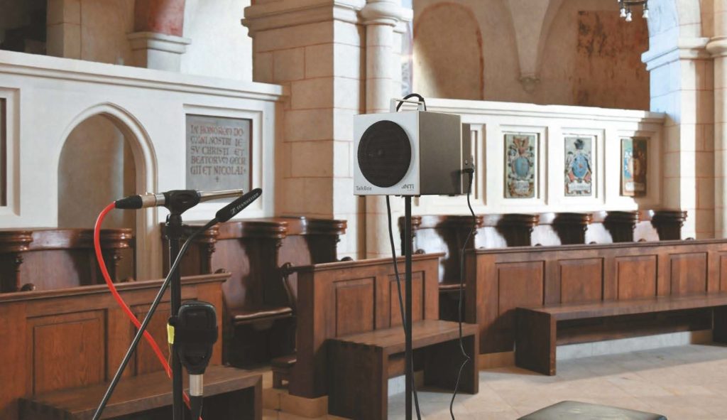 FOTO 13: Die NTI Talkbox als normgerechter Sprecherersatz für Messungen der Sprachverständlichkeit über eine Sprechstelle. Hier im Einsatz für das Mikrofon am Priestersitz des Limburger Doms. (Bild: Dr. Anselm Goertz)