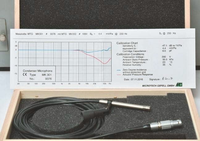 FOTO 06: Microtech Gefell 1/4″ Kondensatormikrofon vom Typ MK301 mit Impedanzwandler MV302. Der Anschluss zu den nachfolgenden Geräten erfolgt mit einem filigranen Lemo Stecker. Beiliegend das Calibration Chart mit allen wichtigen Daten und dem individuellen Frequenzgang. (Bild: Dr. Anselm Goertz)