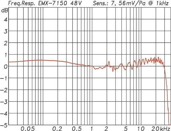 ABB. 06: Gemessener Frequenzgang eines ISEMcon EMX-7150. Die Abweichungen zwischen 20 Hz und 30 kHz belaufen sich auf ±0,7 dB. Das mit einer 1/4″ Elektretkapsel von Panasonic bestückte Messmikro empfiehlt sich damit trotz seinen günstigen Preises auch für anspruchsvolle Aufgaben. (Bild: Dr. Anselm Goertz)