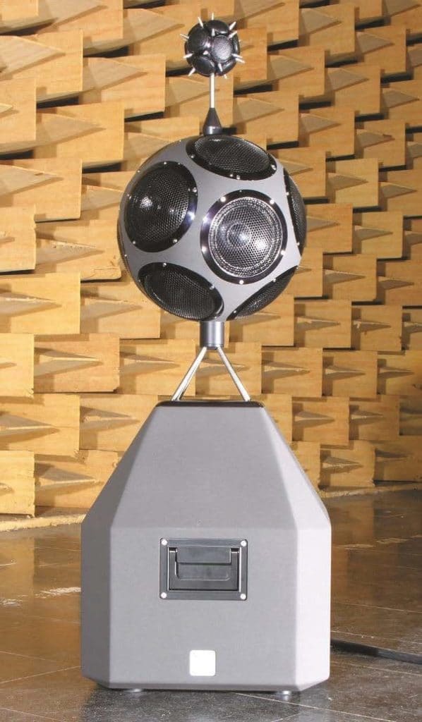 Für spezielle Messung zur Raum- oder Bauakustik und auch zur Sprachverständlichkeit werden Schallquellen als Sender benötigt. Für eine der wichtigsten Messungen in der Raumakustik, der Nachhallzeitmessung, bedarf es einer möglichst rundum gleichmäßig abstrahlenden Quelle und das, soweit möglich, auch noch für einen weiten Frequenzbereich. Typische Lautsprecher für solche Aufgaben sind Dodekaeder-Lautsprecher. Wie der Name es schon sagt, haben wir es mit einem Lautsprecher mit einem zwölfflächigen Gehäuse zu tun. Auf allen zwölf gleichmäßig angeordneten Flächen befinden sich Lautsprecher. Der einfache Dodekaeder eignet sich je nach Ausdehnung für Frequenzen bis ca. 3 kHz und damit für Standardmessungen der Raumakustik.