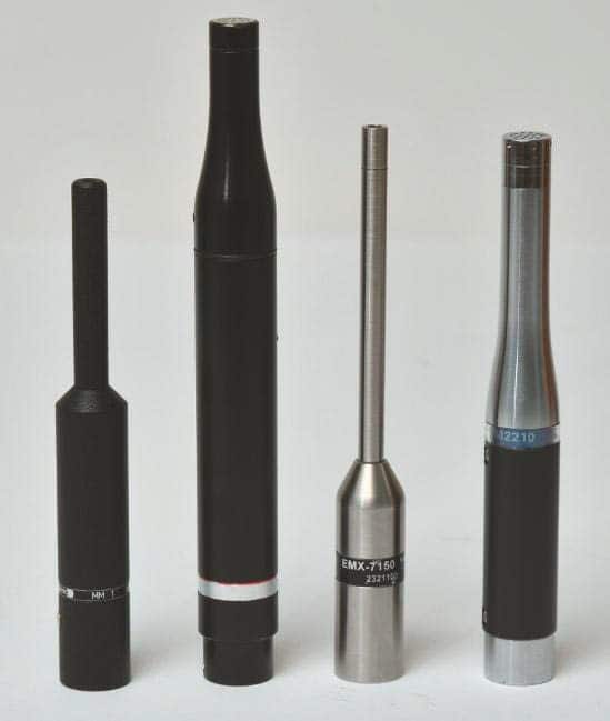FOTO 05: Häufig verwendete Messmikrofone v.l.n.r. Beyerdynamic MM1 NTI Mini SPL, ISEMcon EMX-7150 und NTI M2210. Das M2210 ist ein „echtes“ Kondensatormikrofon mit aufgeschraubter Kapsel. Die drei anderen Modelle sind mit Elektretkapseln bestückt. (Bild: Dr. Anselm Goertz)
