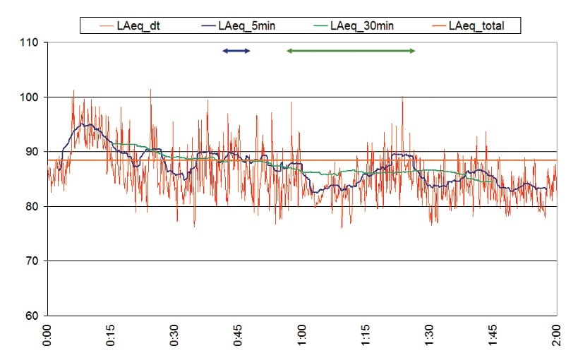 In ABB. 08 ist der über zwei Stunden gemessene Pegelverlauf dargestellt. Die rote Kurve zeigt hoch aufgelöst die Leq-Werte für jedes einzelne kurze Messintervall (dt) mit einer Länge von jeweils 5 s. Der Pegelmesser bestimmt hier den Kurzzeit Leq für 5 Sekunden und speichert diese Werte zusammen mit dem Zeitverlauf ab. Aus den 5 s-Werten lassen sich dann anschließend die Leq-Werte für beliebige längere Zeitintervalle bestimmen. So zeigt die blaue Kurve den gleitend ermittelten Mittlungspegel für die Dauer von 5 Minuten und die grüne Kurve für die Dauer von 30 Minuten. Über die gesamte Messdauer von zwei Stunden gemittelt beträgt der Mittlungspegel 88,4 dBA. Die lautesten 5 Minuten erreichen dem gegenüber einen Wert von 95 dBA.
