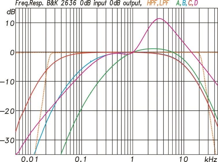 ABB. 02: Bewertungskurven für Pegelmesser mit A-, B-, C- und DCharakteristik. Hochpassfilter bei 22 Hz und Tiefpassfilter bei 22 kHz zur Unterdrückung von Störanteil außerhalb des Hörbereiches. (Bild: Anselm Goertz)