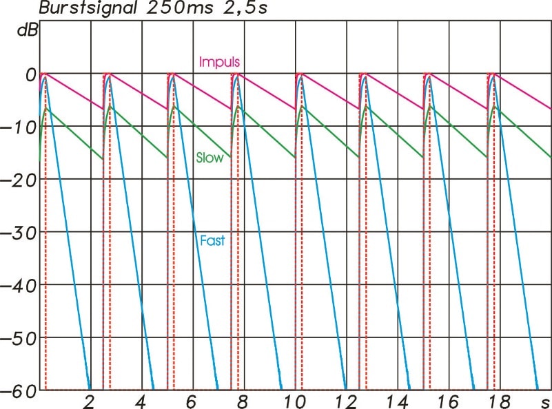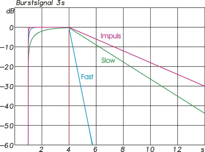 Je kürzer die Zeitkonstante, desto schneller ist die Reaktion auf eine Pegeländerung. Die Zeitkonstante von 125 ms in der Einstellung Fast bewirkt nach dem abrupten Ende eines konstanten Signals einen Abfall der Anzeige mit ca. 34 dB/s.