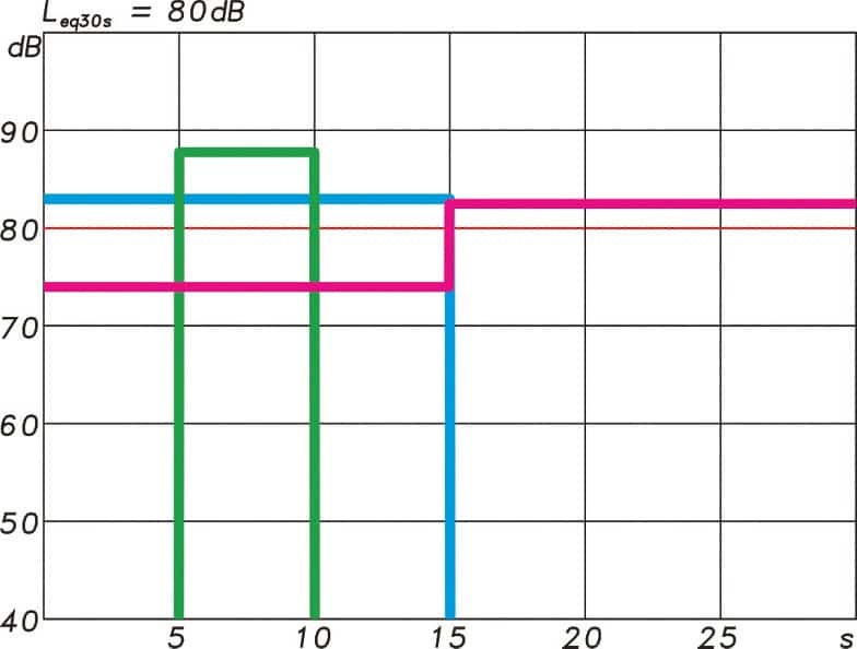 Ein kontinuierliches Geräusch, das über 30 Minuten energetisch gemittelt einen Leq von 85 dB ergibt, würde bei gleicher Mittlungsdauer aber nur 15 Minuten Dauer des Geräusches einen Wert von 82 dB als Leq liefern. Eine Halbierung oder Verdopplung der Einwirkungsdauer senkt oder erhöht somit den Mittlungspegel jeweils um 3 dB. ABB. 07 zeigt dazu drei Pegelverläufe über der Zeit, die alle über den gesamten Zeitraum als Leq gemittelt den gleichen Mittlungspegel ergeben. Ein weiteres Beispiel zur Verwendung von Mittlungspegeln mit unterschiedlichen Zeitintervallen ist die Pegelmessung während einer Sportveranstaltung.
