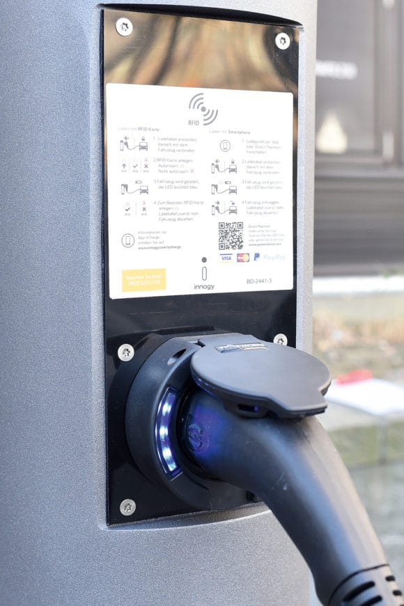 Der Lichtring zeigt bereits aus der Ferne an, ob der Ladepunkt frei ist (leuchtet blau = aktiver Ladevorgang, leuchtet nicht = Ladepunkt frei). (Bild: innogy SE)