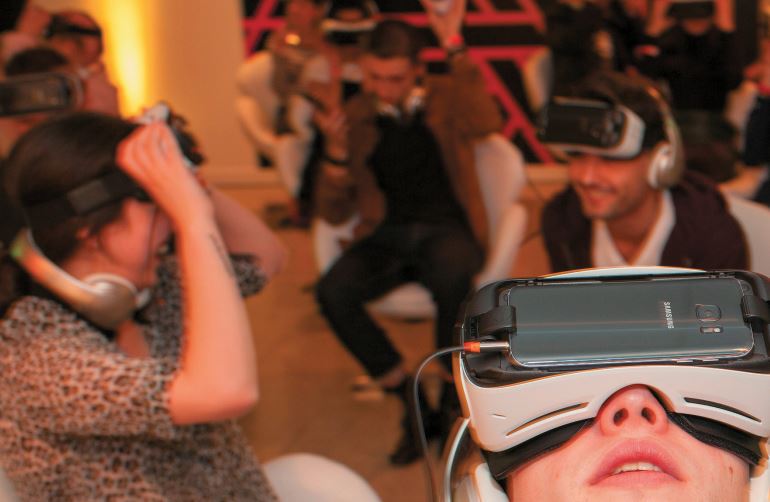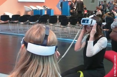 VR-Brillen können auch im Bildungsbereich zur Veranschaulichung naturwissenschaftlicher Prozesse genutzt werden. Die im Bild gezeigte Applikation – eine Visualisierung des Planetensystems mit Samsung Gear VR Brillen – wurde auf der Bildungsmesse didakta gezeigt. (Bild: Helga Rouyer-Luedecke)
